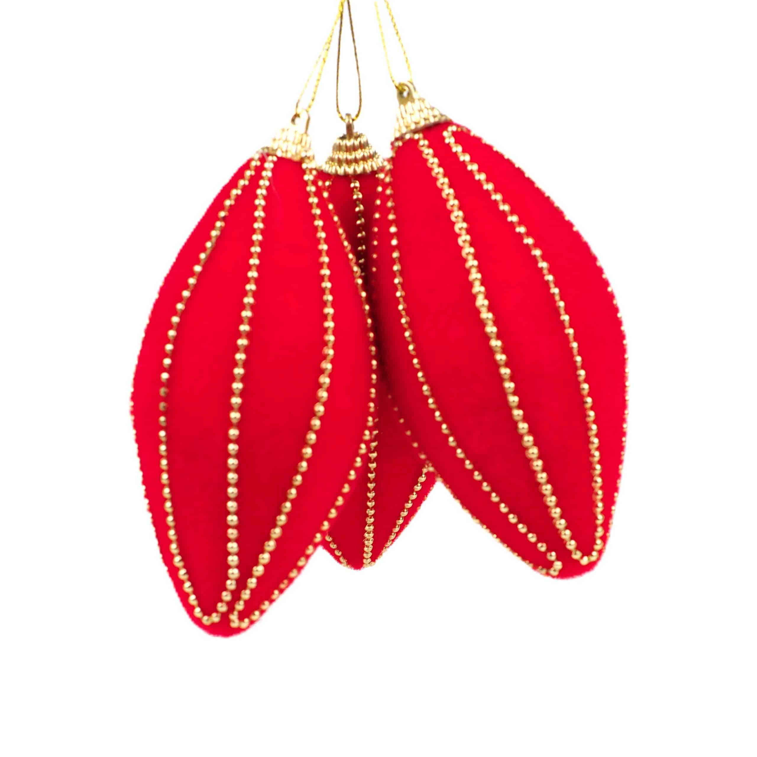 Kadife Yılbaşı Ağaç Süsü – Altın Boncuk Detaylı Damla Dekoratif Süs Kırmızı 8 cm ( 1 Adet )
