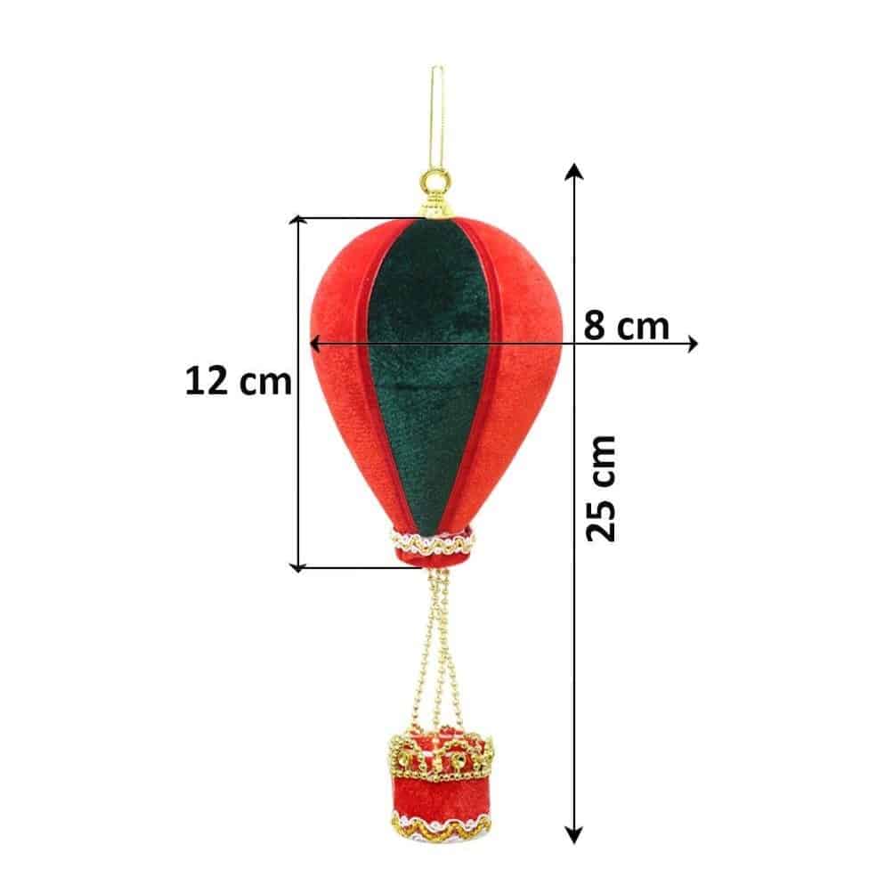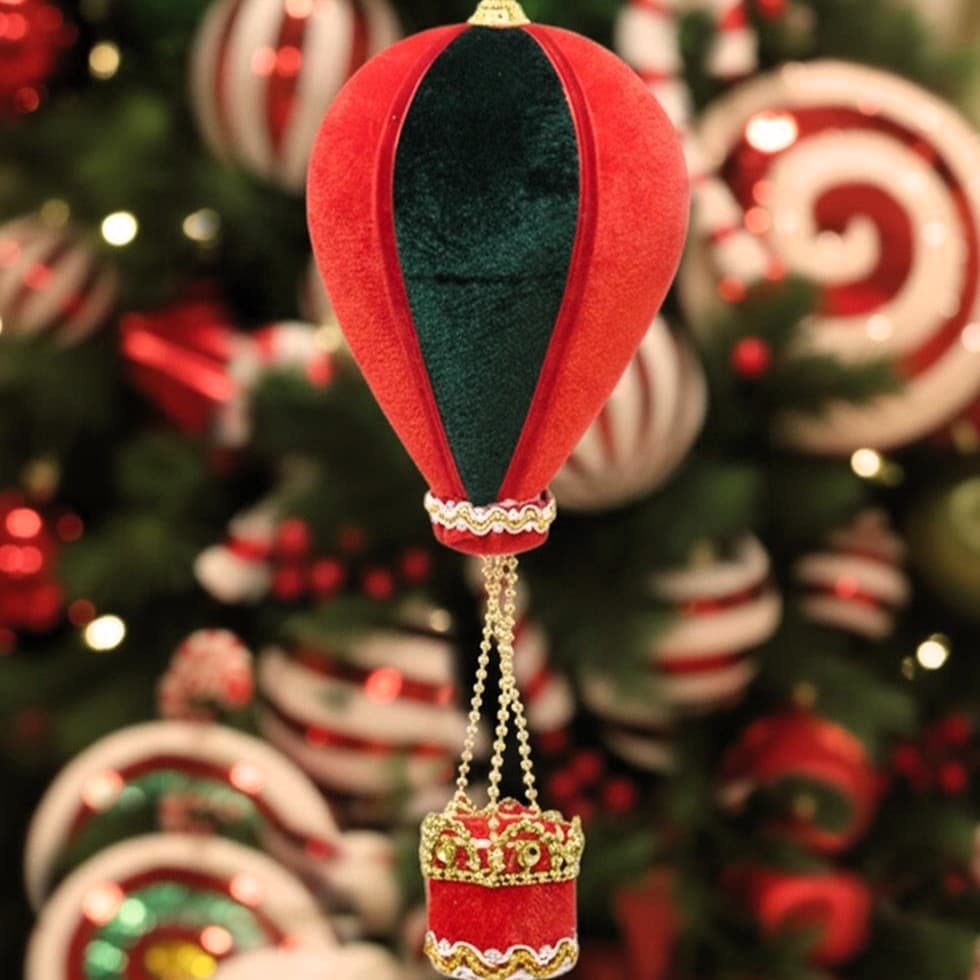 Kırmızı ve yeşil kadife dokusuyla tasarlanan bu şık Sıcak Hava Balonu Yılbaşı Ağaç Süsü, ağacınıza nostaljik ve lüks bir hava katar.