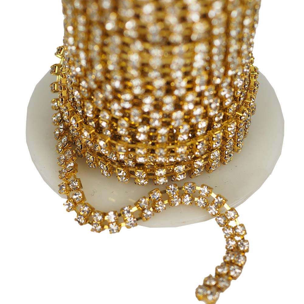 Çift Sıra Şerit Taş Gold Renk SS12 6 MM kalınlığında, takı, toka, elbise, çanta, ayakkabı gibi birçok ürünü süsleme için kullanabilirsiniz. Sık Taşlı Boncuk (SS12)