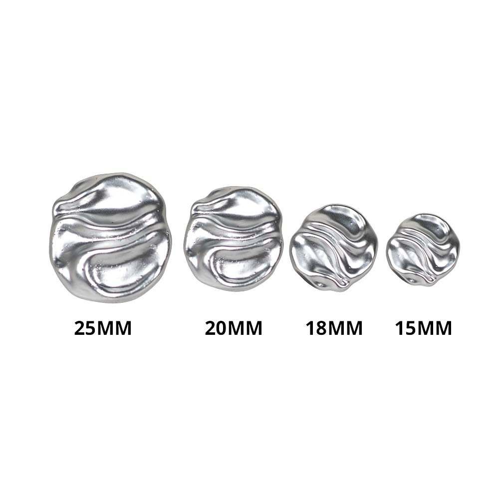 Dalga Model Yassı Düğme Gümüş renk seri, şık, parlak 4 farklı boy seçeneği ile, arkadan tek dikme delikli düğme, hırka, yelek, ceket, gömlek ve dev hırkalar için imal edilmiş şık plastik düğme. 15 MM (1.5CM) – 18 MM (1.8CM) – 20 MM (2.0CM) – 25 MM (2.5CM) boylarında seçenekler mevcuttur.