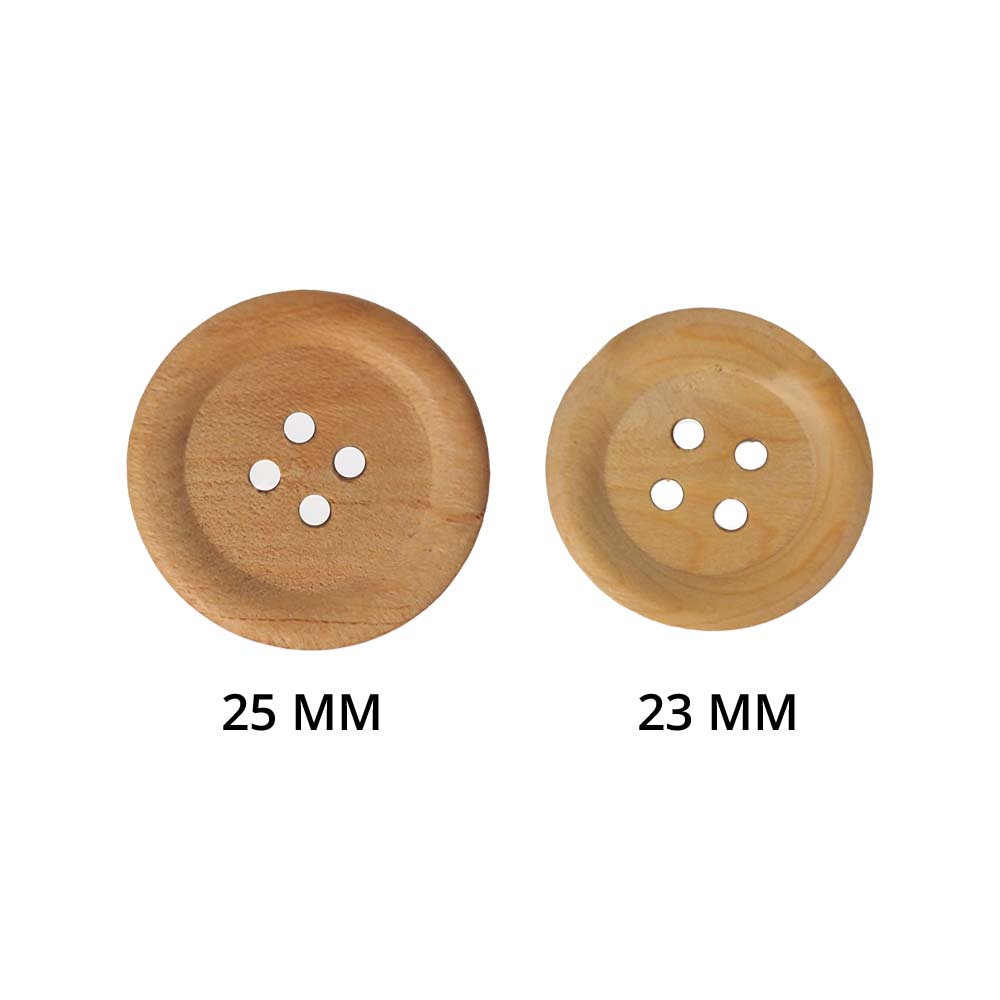 Doğal ahşap düğme, natürel doğal ahşap düğme, 4 delikli ham halde 23 ve 25 mm çapında seçenekleri ile satışta.