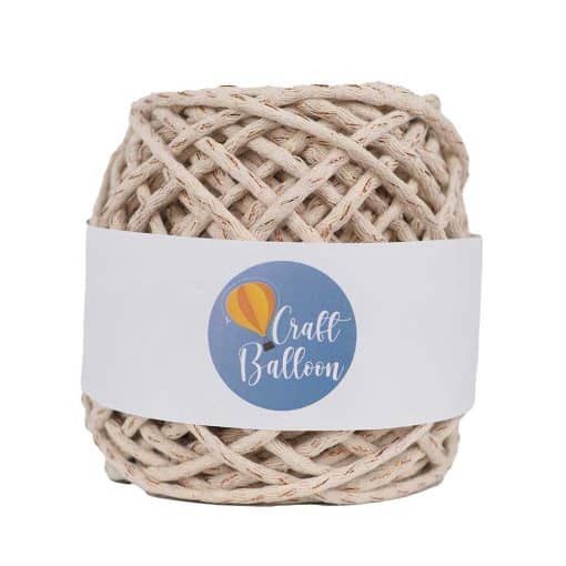 Makrome (Macrame) salıncak, sarkaç, saksılık, sandalye modelleri, kapı süsü, sepet, duvar süsü gibi ürünlerin yapımında kullanılmaya uygun ekru bakır simli örme pamuk ip.