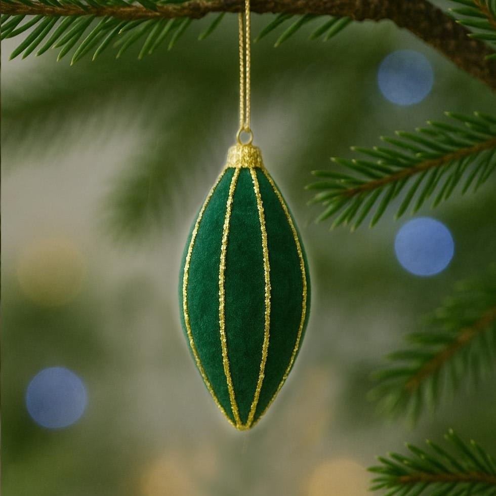Kadife yüzeyi ve altın simli çizgi detaylarıyla premium bir görünüm sunar. Askı ipi hazırdır; doğrudan ağacınıza asabilirsiniz.